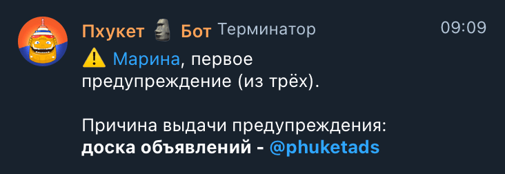 Марина – обычный турист. Она приехала на Пхукет, нашла самый большой чат и написала сообщение: "друзья, у кого снять тойоту?". Но Марина не прочитала правил чата, и через секунду бот удалил её сообщение. Никто это сообщение так и не увидел.