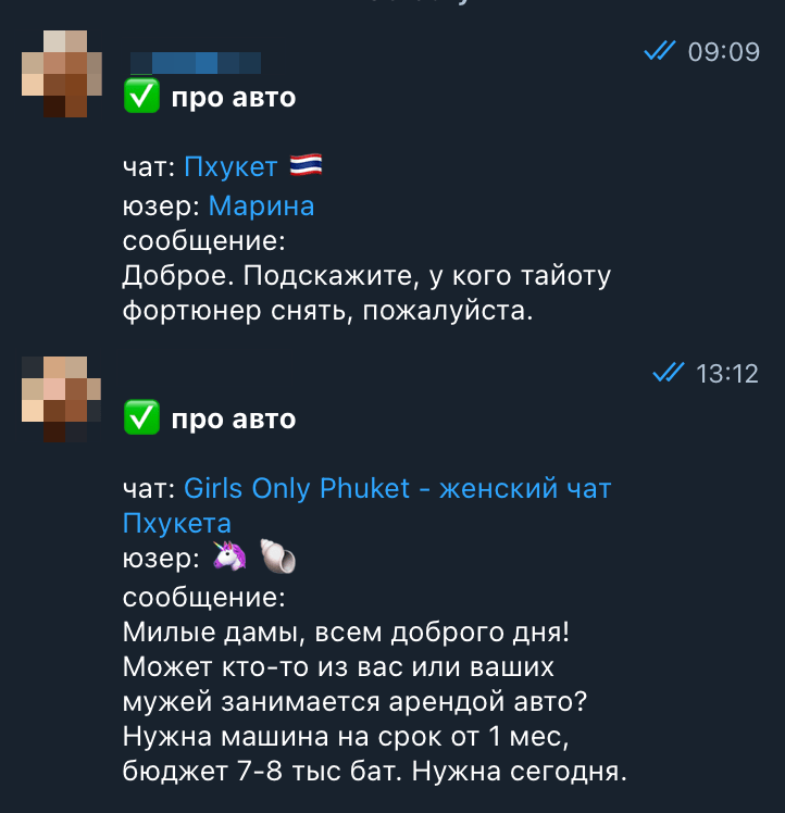 Юрий занимается арендой автомобилей на острове Пхукет. Во время COVID работы мало и важен каждый клиент. Юрий сам нашел и добавился в основные чаты Пхукета. Но чатов очень много, за всеми не уследишь. И конкуренты быстро перехватывают заявки.