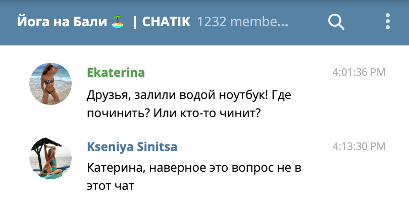 Клиенты не обращают внимания на тематику группы и пишут запрос в первом попавшемся чате. Искать ремонт ноутбука в йога-чате, аренду авто в женском чате или поиск кальяна в чате про еду – это уже привычно.